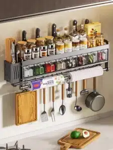 A wall spice rack is one of the best small-space moves: it stores “small items” (spices, condiments) in a thin vertical footprint.