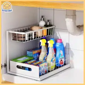 Under-sink storage fails when you can’t reach anything. A pull-out, 2-tier organizer makes the back items accessible in seconds.