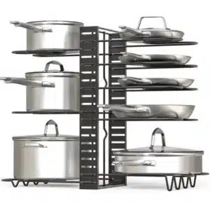 Pot lids are awkward and loud when stacked. A dedicated rack keeps lids upright and separated, and many are expandable to fit your cabinet width.